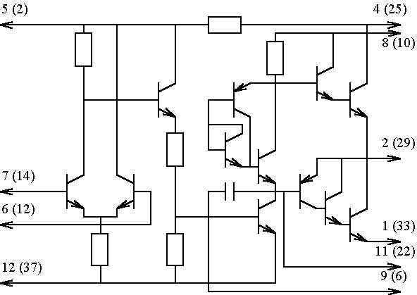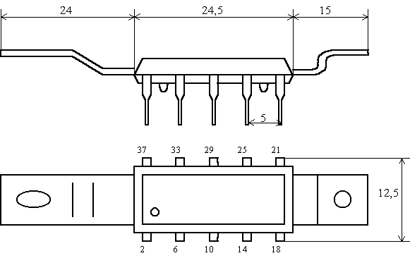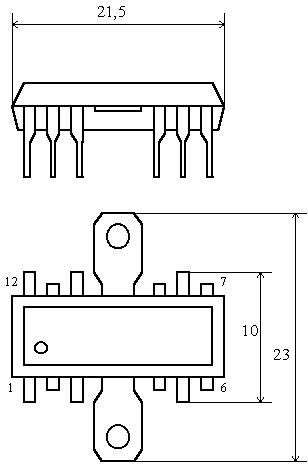 Микросхема представляет собой усилитель мощности с номинальной выходной мощностью 2 Вт при нагрузке 4 Ом для работы в звуковых трактах аппаратуры. Содержит 42 интегральных элемента. Микросхема конструктивно оформлена в корпусе типа 238.12-1 и второй вариант приведен на рисунке, масса не более 2 гр.