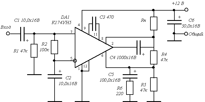 | 6 | Входное сопротивление при Uп = 12 В, fвх = 1 кГц | і 10 кОм |