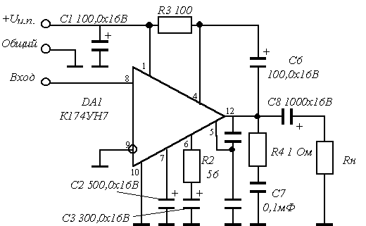 Типовая схема включения ИМС К174УН7. Электрические параметры