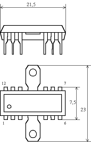 Общие рекомендации по применению Не допускается эксплуатация микросхемы без дополнительного теплоотвода при мощности в нагрузке более 0,27 Вт. При температуре корпуса выше 60°С максимальная рассеиваемая мощность рассчитывается по формуле Допускается кратковременное (в течении 3 мин) увеличение напряжения питания до 18 В. Подача постоянного напряжения от внешнего источника на выводы 5, 6 и 12 микросхемы недопустима. Выходное сопротивление источника питания должно быть не более 0,05 Ом.