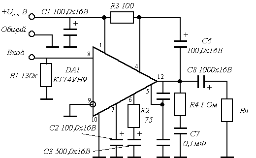 Общие рекомендации по применению При монтаже микросхемы необходимо предусматривать наименьшую длину соединений между выводами и навесными элементами для уменьшения влияния паразитных связей. Допускается использовать микросхемы только в типовой схеме включения. При проведении монтажных операций допускается не более трех перепаек выводов микросхемы. Температура пайки 235 ± 5°С, расстояние от корпуса до места пайки на более 1,5 мм, продолжительность пайки не более 6 с. Допускается использование микросхемы с нагрузкой не менее 3,2 Ом и напряжением питания менее 18 В. При увеличении сопротивления нагрузки и снижении напряжения питания выходная мощность уменьшается. Допускается использовать микросхему при напряжении питании не менее 5 В. Не допускается эксплуатация микросхемы без дополнительного теплоотвода. При температуре корпуса выше 35°С максимальная рассеиваемая мощность рассчитывается по формуле Р=(150-Ткорп)/12, Вт (с теплоотводом), где Ткорп - температура на поверхности теплоотвода у основания пластмассового корпуса микросхемы. Типовое напряжение питания для К174УН9А, К174УН9Б - 5…24 В (Uп = 28 В при отсутствии входного сигнала), К174УН9В - 5…18 В. Допустимое значение статического потенциала 30 В.