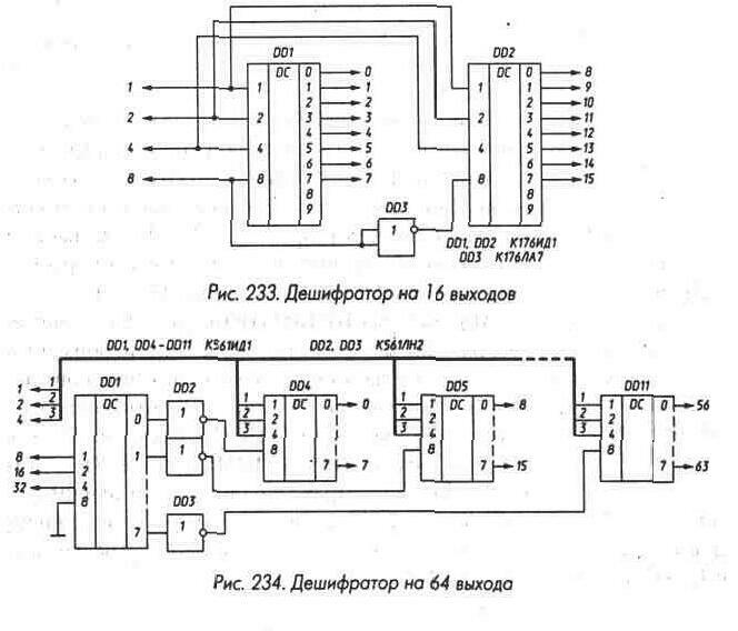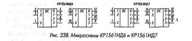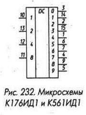 Микросхемы К176ИД1 и К561ИД1 (рис. 232) -дешифраторы на 10 выходов. Микросхемы имеют 4 входа для подачи кода 1-2-4-8. Выходной сигнал лог. 1 появляется на том выходе дешифратора, номер которого соответствует десятичному эквиваленту входного кода, на остальных выходах дешифратора при этом лог. 0. При подаче на входы кодов, соответствующих десятичным числам, превышающим 9, активизируются выходы 8 или 9 в зависимости от сигнала, поданного на вход 1 - при лог. 0 на этом входе лог. 1 появляется на выходе 8, при лог. 1 - на выходе 9. Микросхемы не имеют специального входа стробирования, однако для построения дешифраторов с числом выходов более 10 можно использовать для стробирования вход 8 микросхем, так как выходной сигнал может появиться на выходах 0-7 лишь при лог. 0 на входе 8(рис. 233,234). Микросхема К176ИД2 (рис. 235) - преобразователь двоично-десятичного кода в код семисегментного индикатора, включает в себя также триггеры, позволяющие запомнить входной код. Микросхема имеет четыре информационных входа для подачи кода 1-2-4-8 и три управляющих входа. Вход S, так же как и в микросхемах К176ИЕ- и К176ИЕ4, определяет полярность выходных сигналов: при лог. 1 на входе S на выходах лог. 0 для зажигания сегментов, при лог. 0 на вхо-де S - лог. 1 для зажигания. При подаче лог. 1 на вход К происходит гашение индицируемого знака, лог. 0 на входе К разрешает индикацию. Вход С управляет работой триггеров памяти - при подаче на вход С лог. 1 триггеры превращаются в повторители и изменение входных сигналов на входах 1-2-4-8 вызывает соответствующее изме-нение выходных сигналов. Если же на вход С подать лог.0,запоминаются сигналы, имевшиеся на входах перед подачей лог. 0, микросхема на изменение сигналов на входах 1-2-4-8 не реагирует. Согласование выходов микросхем К176ИД2 с семисегментными индикаторами может производиться так же, как и выходов счетчиков К176ИЕ- и К176ИЕ4. Ток короткого замыкания микросхем К176ИД2 выше, чем у счетчиков, и численно в миллиамперах примерно равен напряжению питания в вольтах. Поэтому можно непосредственно подключать выходы микросхем К176ИД2 к электродам полупроводниковых семисегментных индикаторов серий АЛ305, АЛС321, АЛС324, помня, конечно, о том, что разброс яркости свечения при этом может быть заметен, а сама яркость может быть меньше номинальной. Микросхема К176ИД- имеет ту же разводку выводов и ту же логику работы, что и К176ИД2. Отличие заключается в том, что выходные каскады микросхемы выполнены с "открытым" стоком, поэтому их можно подключать непосредственно к анодам вакуумных люминесцентных индикаторов (рис. 179 с исключенными сборками DA1, DA2). Управляющий вход S микросхемы К176ИД- должен быть при этом соединен с общим проводом. Микросхема 564ИД4 - преобразователь двоично-десятичного кода в код семисегментного индикатора (рис. 235), предназначена прежде всего для управления жидкокристаллическими индикаторами. Так же, как и микросхема К176ИД2, преобразователь позволяет изменять полярность выходных сигналов подачей сигнала управления на вход S - при лог. 0 включению сегментов соответствуют лог. 1 на выходах а - g, при лог. 1 на входе S включению сегментов соответствуют лог. 0. Так же, как и микросхема 564УМ1, микросхема имеет три вывода питания и увеличенную амплитуду выходных сигналов. Это позволяет при напряжении питания большей части микросхем 3...5 В управлять и такими индикаторами, которые тре