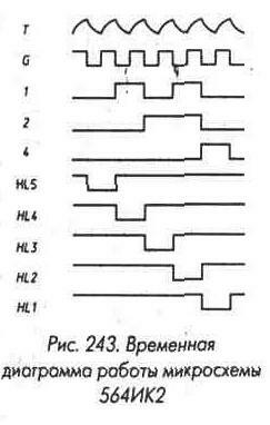 выходах 1, 2, 4 поочередное появление двоичных кодов чисел 0...4, а на выходах дешифратора HL5 - HL1 лог. 0 (рис. 243). Следует иметь в виду, что в те моменты, когда на выходах HL5 - HL1 нет лог. 0, они находятся в высокоимпедансном со-стоянии, так как выполнены с открытым стоком транзисторов с каналом n-типа. По техническим условиям в состоянии лог. 0 при напряжении питания 10 В и выходном втекающем токе 80 мА выходное напряжение не превышает 1 В. Нагрузочная способность выходов счетчика 1, 2, 4 составляет 1,3 мА при напряжении питания 10 В и выходном напряже-