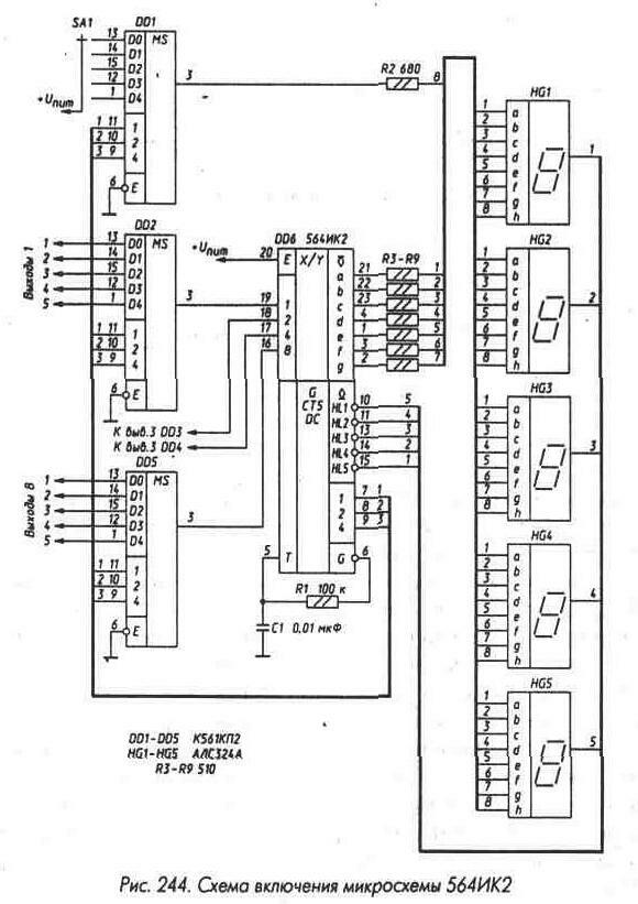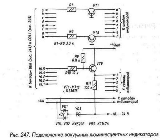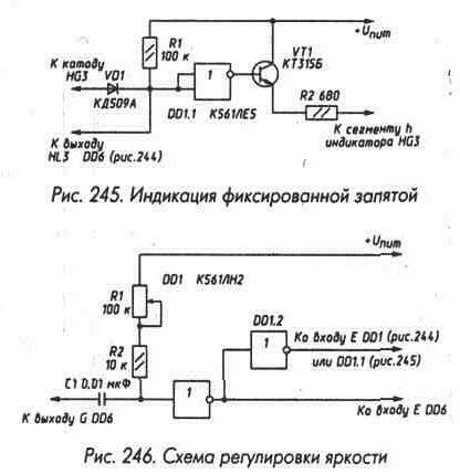 рис.244, и элемента DD1.1 рис. 245. В последнем случае элемент DD1.1 должен иметь не менее двух входов и выполнять функцию ИЛИ-НЕ. Аналогично может быть подключен и пятиразрядный полупроводниковый индикатор АЛС311А. Полупроводниковые индикаторы можно заменить на вакуумные люминесцентные индикаторы (или один многоразрядный), включив