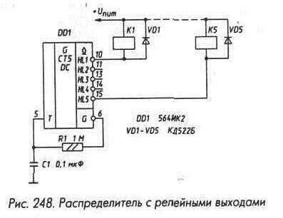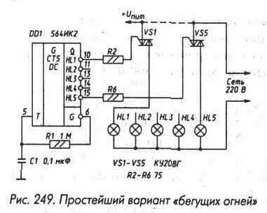 выходами (рис. 248). Обмотки реле в этом устройстве должны быть рассчитаны на напряжение питания микросхемы и на рабочий ток, не превышающий указанный выше для выходов HL1 - HL5. Полярность тока выходов HL1 - HL5 удобна для непосредственного управления симисторами серии КУ208. На рис. 249 приведена схема простейшего варианта "бегущих огней" с использованием микросхемы 564ИК2. Неиспользуемые входы микросхемы в схемах рис. 248 и 249 следует соединить с общим проводом или плюсом питания.