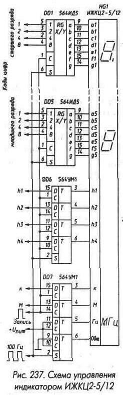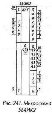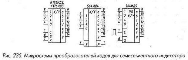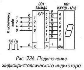 Подключение жидкокристаллического индикатора к микросхеме 564ИД4 проиллюстрировано на рис. 236. На вход S микросхемы подается меандр с частотой 30...200 Гц, этот сигнал проходит без инверсии на выход Р, увеличиваясь по амплитуде, как это описано выше для микросхемы 564УМ1. При подаче на входы 1-8 двоичного кода знака на выходах, соответствующих сегментам, которые надо индицировать, напряжение начинает меняться в противофазе с напряжением на выходе Р, и эти сегменты становятся темными. На тех же выходах, которые соответствуют неиндицируемым сегментам, напряжение меняется синфазно с напря-жением на выходе Р, и сегменты неотличимы от фона. При подаче на входы кодов чисел 0...9 на индикаторе формируется изображение соответствующих цифр, для кодов 10...13 индицируются буквы "L", "Н", "Р", "А", для кода 14 - знак "минус", при подаче кода 15 происходит гашение индикатора. Нагрузочная способность микросхемы такая же, как у 564УМ1, что позволяет использовать микросхему для управления светодиодными индикаторами как с общим анодом, так и с общим катодом без токоограничительных резисторов при напряжении питания 5...10 В и с ограничительными резисторами при 10...15 В. Микросхема 564ИД5 отличается от 564ИД4 наличием на ее входах 1-2-4-8 статического регистра хранения информации со входом записи С и отсутствием выхода Р (рис. 235). -апись в регистр происходит так же, как и в регистр микросхем К176ИД2 и К176ИД-, при