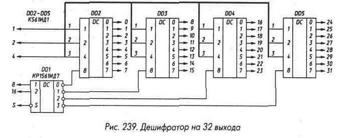 подаче на вход С импульса положительной полярности, регистр при этом "прозрачен" и пропускает на свои выходы (на входы преобразователя кода) информацию со входов. В режим хранения регистр переходит в момент спада входного импульса. Интересно отметить, что одноименные входы и выходы микросхем К176ИД2, К176ИД-, 564ИД4,564ИД5 разведены на выводы с одинаковыми номерами. На рис. 237 приведен пример использования микросхем 564ИД5 и 564УМ1 для управления индикатором ИЖКЦ2-5/12. Этот пятиразрядный индикатор предназначен для использования в цифровом частотомере и, кроме возможности индикации пяти цифр, имеет четыре десятичные запятые (сегменты h) и символ "Гц", перед которым могут индицироваться символы "к" или "М". На микросхемы DD1 - DD5 подводятся коды цифр от микросхем счетчиков, на DD6 - на вход D, соответствующий необходимой запятой - лог. 1, на остальные входы - лог. 0. При подаче импульса положительной полярности на входы С происходит запоминание информации в регистрах микросхем. На входы D двух нижних триггеров микросхемы DD6 поданы разнополярные сигналы, а на входы S всех микросхем - меандр с частотой 30...200 Гц. В результате на выводы "Гц" и "Общ." индикатора HL1 приходят противофазные сигналы и символы "Гц" постоянно индицируются. При необходимости индикации символов "к" или "М" на соответствующие входы микросхемы DD7 следует подать лог. 1, при отсутствии такой необходимости - лог. 0. Микросхема КР1561ИД6 - два стробируемых дешифратора на два входа и четыре прямых выхода (рис. 238). При лог. 0 на входе S лог. 1 появляется на том выходе дешифратора, номер которого соответствует десятичному эквиваленту входного кода, поданному на входы 1 и 2. При лог. 1 на входе S на всех выходах дешифратора лог. 0. Микросхема КР1561ИД7 - два аналогичных дешифратора с инверсными выходами (рис. 238). Наличие инверсных выходов позволяет удобно использовать такую микросхему для стробирования дешифраторов при их соединении для увеличения числа входов (рис. 239), а также описываемых далее мультиплексоров. При необходимости построения дешифратора на 8 выходов из микросхем КР1561ИД6 или КР1561ИД7 их следует дополнить одним инвертором (рис. 240). Микросхема 564ИК2 (рис. 241) не является комбинационной, так же как при строгом отношении не являются комбинационными микросхемы К176ИД2, К176ИД- и 564ИД5, содержащие регистры хранения информации, но их удобно рассматривать в этом разделе как наиболее близкие к дешифраторам и преобразователям кода. Микросхема 564ИК2 предназначена для управления пятиразрядным полупроводниковым семисегментным индикатором или пятью отдельными индикаторами в динамическом режиме. Она содержит преобразователь двоичного кода 1-2-4-8 в код семисегментного индикатора (входы 1, 2, 4, 8 и Е, выходы а, Ь, с, d, e, f, g), генератор на инвертирующем триггере Шмитта (вход Т, выход G), счетчик-делитель на 5, вход которого подключен к выходу генератора. В свою очередь