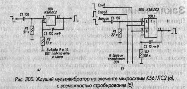 Иногда в радиолюбительских конструкциях можно встретить случаи запуска ждущего мультивибратора, собранного по схеме рис. 297, импульсом, длительность которого превышает длительность выходного импульса, без дифференцирующей цепи на входе. В этом случае устройство формирует выходной импульс соответствующей длительности с пологим спадом (рис. 299, г). Однако положительная обратная связь не замыкается, соединение выхода инвертора DD2 со входом DD1 никакой роли не играет. При таком запуске устройство эквивалентно двум инверторам, между которыми включена дифференцирующая цепь. Более целесообразно применить описанный выше ждущий мультивибратор, собранный по схеме рис. 295. В нем импульс на выходе DD1.2 не имеет затянутых фронтов (рис. 296), входной импульс для DD1.1, как для ждущего мультивибратора по схеме рис. 297, должен быть короче выходного. Использование микросхем, которые могут работать в качестве логических неинвертирующих элементов И или ИЛИ, позволяет упростить схемы ждущих мультивибраторов. На рис. 300 (а) приведена схема ждущего мультивибратора на одном логическом элементе ИЛИ из микросхемы К561ЛС2, на оба управляющих входа которой подано напряжение питания. На рис. 300 (б) проиллюстрирована возможность стробирования запуска четырех ждущих мультивибраторов на микросхеме К561ЛС2. Мультивибратор может запуститься лишь при подаче на вход Строб лог. 1 и фронта положительного импульса на вход запуска. Генерируемый импульс может быть оборван подачей лог. 0 на вход Срыв. Большой гибкостью в отношении своего запуска обладают ждущие мультивибраторы нa JK- и D-триггерах. Устройства по схеме рис. 301 могут быть запущены или коротким импульсом, подаваемым на вход S триггера, или фронтом положительного импульса, подаваемого на вход С. Лог. 1, появляющаяся на прямом выходе триггера при запуске, через резистор R1 начинает заряжать конденсатор С1. Когда напряжение на конденсаторе достигнет порога переключения триггера по входу R, триггер переключится в исходное состояние. Диод VD1 служит для ускорения разряда конденсатора и восстановления исходного состояния, во многих случаях он может быть исключен. Длительность импульсов для ждущего мультивибратора определяется по той же формуле" что и для дифференцирующей цепочки.