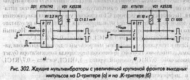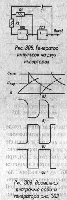 связь через резистор R1 стремится установить напряжения на входе и выходе инвертора DD1 равными, в результате чего скорость изменения напряжения на выходе инвертора DD1 уменьшается и на спаде импульса появляется характерная ступенька. Если порог переключения инвертора DD2 равен порогу переключения инвертора DD1, при приближении напряжения на выходе DD1 к этому порогу начнется повышение напряжения на выходе DD2 (рис. 307, в), что вызовет лавинообразный процесс переключения обоих инверторов генератора. Нетрудно видеть, что при тех же параметрах времязадающей RC-цепи период колебаний в генераторе по схеме рис. 305 будет несколько больше, чем у генератора по схеме рис. 303, а стабильность периода - хуже, так как напряжение на входе DD1 перед началом лавинообразного процесса меняется более плавно, и небольшие изменения порогового напряжения одного инвертора относительно другого приведут к значительному изменению периода работы генератора. Более того, при значительном отличии порогов переключения инверторов (а в микросхемах КМОП диапазон положения порога переключения составляет от 1/3 до 2/3 напряжения питания) генератор может вообще не заработать - напряжение на выходе первого инвертора за счет отрицательной обратной связи через резистор R1 застабилизируется на уровне его порога переключения, при этом оно будет находиться вне зоны переключения второго инвертора, положительная обратная связь через конденсатор С1 не замкнется, и инвертор DD2 не переключится. Поэтому в генераторе по схеме рис. 305 следует всегда использовать инверторы одной микросхемы. Для генератора по схеме рис. 303 разброс порогов переключения инверторов не играет никакой роли, и инверторы могут быть из разных микросхем. Поскольку процесс переключения инверторов в генераторе по схеме рис. 305 длится большее время, потребляемый этим генератором от источника питания ток больше. Из рассмотрения работы генераторов следует важный практический вывод - выходной сигнал нежелательно снимать с выхода инвертора, к входу которого подключены времязадающие конденсатор и резистор (DD1). Фронты импульсов на этом выходе затянуты, кроме того, в генераторе по схеме рис. 305 на фронтах на этом выходе имеется ступенька, и их использование может привести к неодновременному срабатыванию элементов, подключенных к этому выходу, изза разброса порогов переключения микросхем. Кроме того, для триг-геров и счетчиков техническими условиями длительность фронтов импульсов, подаваемых на счетный вход, ограничена сверху, и подача затянутых фронтов на них недопустима. Эта рекомендация относится и к другим схемам генераторов и ждущих мультивибраторов. Следует отметить, что из-за емкостной нагрузки несколько затягиваются фронты импульсов также на тех выходах элементов генераторов и ждущих мультивибраторов, к которым подключены времязадающие конденсаторы (DD2 на рис. 303 и 305). Поэтому выходные импульсы генератора по схеме рис. 303 лучше брать с выхода DD3, в любим генераторе или ждущем мультивибраторе устранить такое затягивание фронта можно включением последовательно с конденсатором или с входом DD1 резистора с сопротивлением 5...10 кОм.