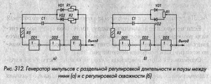 Для того чтобы регулировка частоты при помощи резистора R2 была эффективной, необходимо исключить ограничение перепадов напряжения, передаваемых через конденсатор С1, которое существует в традиционных схемах генераторов, на входных диодах элемента DD1. Для этого установлен резистор R3, его сопротивление должно быть равно сумме сопротивлений резисторов R1 и R2 или несколько больше, чтобы по крайней мере в 2 раза уменьшить величину перепада. При меньшей величине или отсутствии R3 частота практически не изменяется, если сопротивление нижней по схеме части резистора R2 в сумме с R3 меньше сопротивления верхней части R2 в сумме с R1. Чтобы сохранить строй при регулировке частоты, сопротивление резистора R3 должно быть в несколько десятков раз меньше, чем резисторов R4 - Rп. Для облегчения выполнения этого условия между выходом элемента DD2 и резистором R3 можно установить эмиттерный повторитель на транзисторе р-n-р. Верхний вывод резистора R1 можно подключить И к общему проводу, но нагрузочная способность микросхем КМОП, так же как ТТЛ, в единичном состоянии ниже, чем в нулевом, поэтому выполнение указанного выше условия в этом случае затруднено. Ориентировочные значения сопротивлений резисторов: R1 в сумме с R2 и R3 не менее 5 кОм, R1 - более 0,01R2, R4 -Rп - в 30 и более раз больше суммы R1 и R2. При наличии эмиттерного повторителя номиналы всех резисторов можно уменьшить в 10 раз. Данный генератор удобно использовать для модуляции частоты импульсов, если на верхний по схеме вывод резистора R1 подать управляющее переменное напряжение. На рис. 312 (а) приведена схема генератора, в котором можно отдельно регулировать длительность импульса и паузу между импульсами. В генераторе по схеме рис. 312 (б) можно в широких пределах регулировать скважность импульсов, практически не изменяя их частоту. -апуск любого генератора и его останов можно производить установкой в качестве любого из DD1 - DD3 какого-либо двухвходового логического элемента (И-НЕ, ИЛИ-НЕ, Исключающее ИЛИ) и подачей на его второй вход управляющего сигнала. На рис. 313 приведена схема генератора, формирующего пачки импульсов с частотой заполнения 1000 Гц, частота повторения пачек - около 1 Гц, длительность - 0,5 с. Генерация пачек происходит лишь при подаче лог. 1 на вход -апуск генератора. Первый импульс первой пачки появляется сразу после подачи разрешающего сигнала.