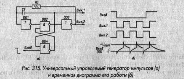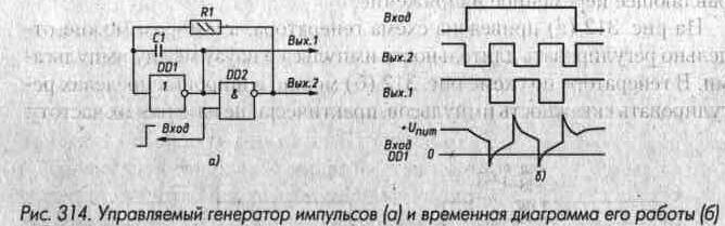 На рис. 314 приведена схема генератора, генерирующего на своем выходе импульсы, задержанные относительно момента подачи разрешающего сигнала. Все генерируемые на Вых. 1 генератора импульсы имеют одинаковую длительность. Если сигнал разрешения снимается до окончания очередного импульса, импульс генерируется полностью. На Вых. 2 импульсы появляются сразу после подачи разрешающего сигнала, но последний импульс может быть неполной длительности. Если необходимо совместить выдачу импульсов сразу после сигнала разрешения с обеспечением полной длительности последнего импульса независимо от момента снятия импульса разрешения, можно использовать генератор по схеме рис. 315 (а). Особенность этого генератора - его универсальность. Если входной запускающий импульс отрицательной полярности имеет длительность, меньшую периода колебаний генератора, на его выходах сформируется один импульс, то есть генератор действует как ждущий мультивибратор. При подаче входного импульса с длительностью, превышающей период, будет сформировано несколько импульсов полной длительности (рис. 315, б). Простой управляемый генератор можно собрать на основе триггера Шмитта микросхемы К561ТЛ1 или КР1561ТЛ1 по схеме рис. 316 (неуправляемый - на триггере рис. 275). При лог. 0 на входе -апуск на выходе - лог. 1. При подаче на