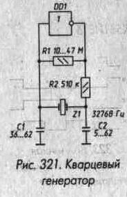 фазовые соотношения для частоты задающего генератора 32768 Гц приведены на рис. 204. При их использовании следует помнить о коротких "просечках" на выходах Т1 и Т-, также показанных на рис. 204. Микросхема имеет еще один счетчик с коэффициентом деления, равным 60. Его вход может быть подключен как к задающему генератору, так и к любому выходу первого счетчика. При подключении его к выходу S1 частота импульсов на выходе второго делителя будет в 196608 раз меньше частоты задающего генератора. Хотя стабильность частоты RC-генераторов на микросхемах КМОП довольно высока (особенно в сравнении с генераторами на микросхемах ТТЛ), в ряде случаев более удобно применить кварцевый генератор с последующим делением частоты до необходимого уровня. Такой вариант получения необходимой частоты обеспечит не только высокую стабильность, но и исключит необходимость в подстроечных элементах, а габариты и стоимость кварцевого резонатора на 32768 Гц для наручных часов меньше, чем хорошего металлопленочного конденсатора.