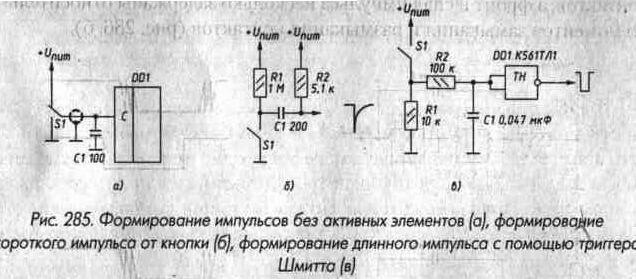 В цифровых устройствах на микросхемах большую роль играют различные формирователи импульсов - от кнопок и переключателей, из сигналов с пологими фронтами, дифференцирующие цепи, а также мультивибраторы. В данном разделе книги рассмотрены некоторые вопросы построения таких формирователей и генераторов на микросхемах серий КМОП. Как известно, непосредственная подача сигналов от механических контактов на входы интегральных микросхем допустима не всегда изза так называемого "дребезга" - многократного неконтролируемого замыкания и размыкания контактов в момент их переключения. Если входы, на которые подается сигнал, нечувствительны к дребезгу, например входы установки триггеров и счетчиков, непосредственная подача сигналов допустима (рис. 282). Подача сигналов на счетные входы требует специальных мер по подавлению дребезга, без них возможно многократное срабатывание триггеров и счетчиков.