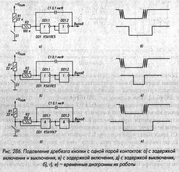это не очень удобно, так как в одной микросхеме содержится всего один девятивходовый неинвертирующий элемент И и один инвертор. Большое входное сопротивление микросхем КМОП позволяет в некоторых случаях обойтись вообще без активных элементов для подавления дребезга. На рис. 285 (а) приведена схема подачи импульсов от кнопки на счетный вход триггера или счетчика. Конденсатор С1 в исходном состоянии заряжен до напряжения питания. При нажатии на кнопку размыкание нормально замкнутого контакта не приведет к изменению напряжения на конденсаторе С1. Первое касание подвижного и нормально разомкнутого контакта приведет к быстрому разря-ду конденсатора С1 и напряжение на нем станет равным нулю. Дальнейший дребезг контактов не приведет к изменению напряжения на конденсаторе. Недостатком схемы является опасность наводок помех на проводник, соединяющий кнопку и вход микросхемы. Если наводки действительно возникают, этот проводник следует заэкранировать. Все рассмотренные выше схемы подавления дребезга требовали применения переключающих контактов кнопок. Если выполнение этого требования затруднено, возможно использование устройств по схемам рис. 285 (б, в). Цепь на схеме рис. 285 (б) формирует короткий импульс отрицательной полярности (порядка 0,7 мкс на уровне 0,5) в момент первого касания контактов кнопки, в результате чего конденсатор С1 быстро заряжается через резистор R2. Дальнейший дребезг контактов кнопки не влияет на выходное напряжение, так как разряд конденсатора С1 происходит через резистор R1 значительно большей величины. Если необходимо получить длительность выходного импульса, равную длительности нажатия на кнопку с одной парой контактов, можно использовать подавление дребезга с помощью интегрирующей цепи и триггера Шмитта (рис. 285, в). Дребезг импульса на резисторе R1 сглаживается цепью R2C1. Триггер Шмитта DD1 формирует крутые фронты выходного сигнала. Для подавления дребезга контактов кнопки с одной парой контактов можно использовать цепь, три варианта схемы которой приведены на рис. 286. Цепь по схеме рис. 286 (а) По функционированию близка интегрирующей цепи и триггеру Шмитта рис. 285 (в). В исходном состоянии на входе и выходе цепи лог. 1. При замыкании кнопки S1 на левой обкладке конденсатора С1 напряжение начинает снижаться и, если постоянная времени R2C1 выбрана достаточно большой, достигает порога переключения элемента DD1.1 после прекращения дребезга Элементы DD1.1 и DD1.2 переключаются, на выходе появляется лог. 0 Положительная обратная связь обеспечивает крутые фронты сигнала на выходе элемента DD1.2. При размыкании контактов переключение происходит аналогично. В результате на выходе цепи формируется импульс, длительность которого соответствует времени замыкания контактов, а фронт и спад импульса несколько задержаны относительно моментов замыкания и размыкания контактов (рис. 286, б). Если необходимо получить фронты выходного сигнала точно в моменты размыкания или замыкания кнопки, можно использовать варианты цепи по схемам рис. 286 (в, д). Первая из них (рис. 286, в) при замыкании кнопки формирует на выходе лог. О аналогично цепи рис. 286 (а). При размыкании кнопки лог. 1 поступает на нижний по схеме вход элемента DD1.1, оба элемента DD1.1 и DD1.2 переключаются, лог. 1 с выхода элемента DD1.2 через конденсатор С1 поступает на вход элемента DD1.1 и удерж