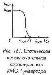 Рассмотрим внутреннюю структуру микросхем КМОП на примере двухвходового логического элемента ИЛИ-НЕ (рис. 160). Основу этого элемента составляют два транзистора структуры МОП с индуцированным каналом р-типа VT1 и VT2 и два транзистора с каналом n-типа VT3 и VT4. Резисторы и диоды являются вспомогательными и в нормальной работе элемента участия не принимают. При подаче на оба входа напряжения, близкого к нулю (лог. 0), транзисторы VT3 и VT4 закрыты, транзисторы VT1 и VT2 открыты и соединяют выход элемента с источником питания. На выходе элемента напряжение близко к напряжению источника питания (лог. 1). Если на один из входов, например вход 1, подать лог. 1, транзистор VT2 закроется, транзистор VT4 откроется и соединит выход элемента с общим проводом, на выходе элемента появится лог. 0. Такой же результат будет при подаче лог. 1 на вход 2 или при подаче лог. 1 на оба входа одновременно. Таким образом, изображенный на схеме рис. 160 элемент выполняет функцию ИЛИ-НЕ на два входа. Для увеличения числа входов элемента увеличивают число последовательно соединенных транзисторов с каналом р-типа и параллельно соединенных транзисторов с каналом n-типа. Для построения элементов с функцией И-НЕ транзисторы с каналом р-типа соединяют параллельно, с каналом п-типа - последовательно. На рис. 161 приведена статическая переключательная характеристика инвертирующего МОП-элемента - зависимость его выходного напряжения от входного. Как видно из зависимости, переключение элемента происходит при входном напряжении, близком к половине напряжения питания. Диоды VD7 и VD8 (рис. 160) являются неотъемлемой частью МОП-транзисторов, диоды VD1 - VD6 и резисторы R1 и R2 специально вводятся в состав элемента для защиты МОП-