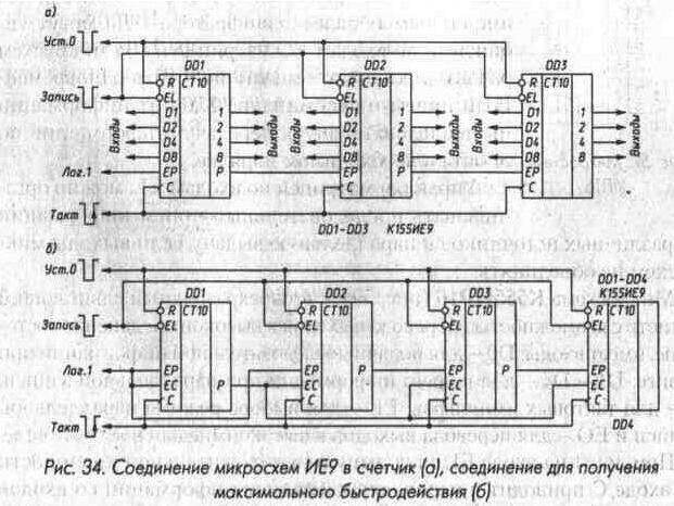 Для установки рассмотренной декады в 0 внешним сигналом необходимо введение в нее логических элементов И-НЕ (рис 27) В табл. 4 приведены номера выводов микросхем, которые нужно соединить между собой для получения различных К Все делители, полученные соединением выводов по табл. 4, работают по одно му принципу - при достижении состояния, соответствующего необходимому коэффициенту пересчета, происходит установка счетчика в 0. Исключение составляет делитель на 7 на микросхеме ИЕ2. В этом делителе после подсчета шести импульсов на входах R9 формируются уровни лог. 1, поэтому из состояния 5 делитель сразу переходит в состояние 9, минуя 6,7 и 8 Код работы этого делителя - невесовой Делители на микросхемах ИЕ5 и ИЕ2 работают в весовом коде 1-2-4-8, на микросхеме К155ИЕ4 - в коде 1-2-4-6 при использовании входа 14 и в коде 1-2-3 - при использовании входа 1. Микросхемы ИЕ6 и ИЕ7 - реверсивные счетчики. Первый из них - двоично-десятичный, второй - двоичный Оба работают в коде 1-2-4-8 Цоколевка обеих микросхем одинакова (рис 28), различие в том, что первый считает до 10, второй до 16 Рассмотрим для примера работу микросхемы ИЕ6 В отличие от рассмотренных ранее счетчиков, эта микросхема имеет большее число Таблица 4
