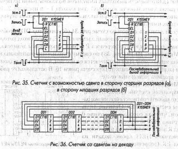 Микросхема ИЕ9 (рис. 33) - синхронный десятичный счетчик с возможностью параллельной записи информации по фронту тактового импульса, имеет девять входов. Подача лог. 0 на вход R независимо от состояния других входов приводит к установке триггеров микросхемы в состояние 0. Для обеспечения режима счета на входе R необходимо подать лог. 1, тот же сигнал должен быть подан на входы разрешения параллельной записи EL, разрешения ЕС, разрешения выдачи сигнала переноса ER Изменение состояния триггеров счетчика при счете происходит по спаду импульсов отрицательной полярности, подаваемых на вход С. При подаче лог. 0 на вход EL микросхема переходит в режим параллельной записи информации со входов D1 - D8. -апись происходит по спадам импульсов отрицательной полярности на входе С, что позволяет использовать микросхему в режиме сдвигающего регистра. При записи на входе R должна быть лог. 1, сигналы на входах ЕС и ЕР произвольны. На выходе переноса Р лог. 1 появляется в том случае, когда счетчик находится в состоянии 9, а на входе ЕР - лог. 1, в остальных случаях на выходе Р лог. 0. Подача лог. 0 на вход ЕР запрещает выдачу лог. 1 на выходе Р и счет импульсов. Подача лог. 0 на вход ЕС запрещает счет, но не запрещает выдачу сигнала переноса. Сигнал запрета счета (лог. 0 на входах ЕС и ЕР) действует лишь в том случае, если он полностью перекрывает по длительности импульс отрицательной полярности на входе С, в том числе он может совпадать с ним по времени. Для обеспечения параллельной записи лог. 0 на вход EL информация на входы D1 - D8 может быть подана как при лог. 1, так и при лог. 0 на входе С и удерживаться до момента перехода лог. 0 на входе С в лог. 1, когда и произойдет запись. Для обеспечения счета с числа, введенного в микросхему при параллельной записи, лог 0 на входе EL должен быть изменен на лог. 1 или одновременно с переходом лог. 0 в лог. 1 на входе С, или при лог. 1 на входе С. На рис. 34 (а) приведена схема соединения микросхем ИЕ9 в многоразрядный синхронный счетчик, которая снижает быстродействие счетчика, так как для его нормальной работы необходимо, чтобы сигнал переноса от младшего разряда прошел через все микросхемы до старшего разряда до подачи очередного тактового импульса. Для получения максимального быстродействия многоразрядного счетчика, равного быстродействию отдельной микросхемы, микросхемы можно соединить по схеме рис. 34 (б). В этом случае сигнал переноса с выхода Р микросхемы DD1 разрешает работу остальных микросхем, соединенных в счетчик по схеме рис. 34 (а), лишь в те моменты, когда микросхема DD1 находится в состоянии 9, поэтому от счетчика DD2 - DD9 требуется быстродействие в 10 раз меньшее быстродействия микросхемы DD1, что обеспечивается при любой практически встречающейся длине счетчика. Как уже указывалось выше, микросхемы ИЕ9 могут работать в режиме сдвигающего регистра. Для обеспечения такого режима необходимо входы D1 - D8 соединить с выходами 1-2-4-8 в нужном порядке. Для сдвига информации на один двоичный разряд по каждому тактовому импульсу в сторону старших разрядов соединение необходимо произвести в соответствии с рис. 35 (а). Для обеспечения динамической индикации удобно сдвигать информацию сразу на один десятичный разряд, а сдвигающий регистр замыкать в кольцо. Такая возможность проиллюстрирована на рис. 36. На рис. 36 не показаны цепи подачи импульсов и управля