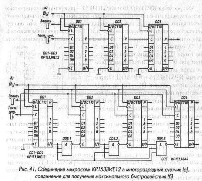8,7 и т. д. При переходе счетчика в состояние 0 на выходе 0/9 появляется лог. 1, а одновременно с восьмым импульсом на входе С, переключающим счетчик в состояние 9, на выходе Р формируется импульс отрицательной полярности. Схема соединения микросхем КР1533ИЕ12 в многоразрядный счетчик показана на рис. 41 (а). Из-за последовательного переключения быстродействие такого счетчика в реверсивном режиме снижается относительно быстродействия одной микросхемы. Если необходим реверсивный счетчик с максимально возможным быстродействием, его собирают по схеме рис. 41 (б). В этом счетчике все триггеры микросхем переключаются одновременно и его быстродействие не зависит от числа разрядов. Однако для каждого десятичного разряда, кроме первого, требуется элемент И-НЕ с числом входов, возрастающим по мере роста номера разряда. В зависимости от необходимого быстродействия возможно построение различных вариантов последовательно-параллельного счетчика. Можно, например, не использовать выход 0/9 микросхемы DD4 (рис. 41, б), а ее выход Р соединить с входом тактовых импульсов второго такого счетчика. Микросхема КР1533ИЕ13 (рис. 39) аналогична КР1533ИЕ12, но ее коэффициент пересчета равен 16. Все правила ее использования и схемы включения соответствуют микросхеме КР1533ИЕ12. Микросхема ИЕ14 (рис. 42) во многом напоминает микросхему ИЕ2. Она также содержит счетный триггер с входом С2. При соединении выхода 1 счетного триггера (вывод 5) с входом С2 образуется двоично-десятичный счетчик, работающий в коде 1-2-4-8. Срабатывание триггера и делителя на 5 происходит по спадам импульсов положительной полярности. Различие с микросхемой ИЕ2 заключается в полярности импульсов сброса - триггеры микросхемы ИЕ14 устанавливаются в 0 при подаче на вход R лог. 0. Кроме того, в микросхеме ИЕ14 есть возможность предварительной установки триггеров счетчика. Для установки триггеров необходимый код следует подать на входы D1 - D8, а на вход L - импульс отрицательной полярности. При лог. 0 на входе L сигналы на выходах 1-8 повторяют сигналы на входах D1 - D8, при лог. 1 происходит запоминание и возможен счетный режим работы микросхемы.