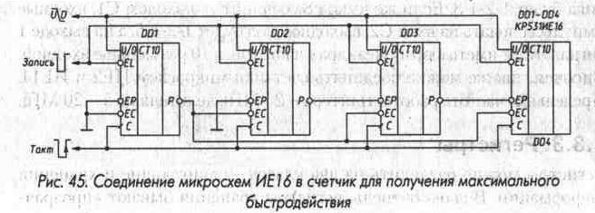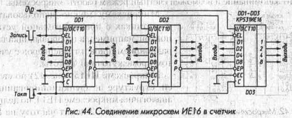 U/D, вход сброса отсутствует. При лог. 1 на входе U/D счетчик считает вверх, при лог. 0 - вниз. Синхронная параллельная запись информации в микросхемы КР531ИЕ16 и КР531ИЕ17 происходит со входов D1 - D8 по спаду тактового импульса отрицательной полярности на входе С и подаче лог. 0 на вход разрешения загрузки EL. При счете на входе EL должна быть лог. 1. Отличием описываемых микросхем от ИЕ9 и ИЕ10 является также полярность сигналов разрешения переноса ЕР и разрешения счета ЕС (для разрешения работы на эти входы необходимо подать лог. 1). Соответственно выходным разрешающим сигналом на выходе переноса Р является лог. 0, он появляется в случае, когда микросхема КР531ИЕ16 досчитала до состояния 9 (КР531ИЕ17 - до состояния 15) при прямом счете или до 0 при обратном, а на входе разрешения переноса ЕР - лог. 0. Примеры соединения микросхем КР531ИЕ16 и КР531ИЕ17 в многоразрядный счетчик приведены на рис. 44 и 45. При соединении микросхем по схеме рис. 44 максимальная частота счета снижается по отношению к максимально возможной для одной микросхемы, при соединении по схеме рис. 45 - не снижается. Следует помнить, что переключение направления счета на входе U/D и смену информации на входах ЕР и ЕС следует производить в паузе между тактовыми импульсами, то есть при лог. 1 на входах С микросхем или в момент изменения сигнала на этих входах с лог. 0 на лог. 1. Входной ток микросхем по входу ЕР в состоянии лог. 0-4 мА. Микросхема ИЕ18 (рис. 46) аналогична по функционированию микросхеме ИЕ11, но ее коэффициент пересчета равен 16. Рассмотренные выше микросхемы счетчиков серии КР531 имеют входные токи по управляющим входам, как правило, больше стандартных. При подаче на входы лог. 0 токи составляют для микросхем КР531ИЕ9 и КР531ИЕ10 по выводу 2 - 5 мА, выводу 10-3 мА, выводу 9-4 мА. Для микросхем КР531ИЕ11 и КР531ИЕ18 ток по вы