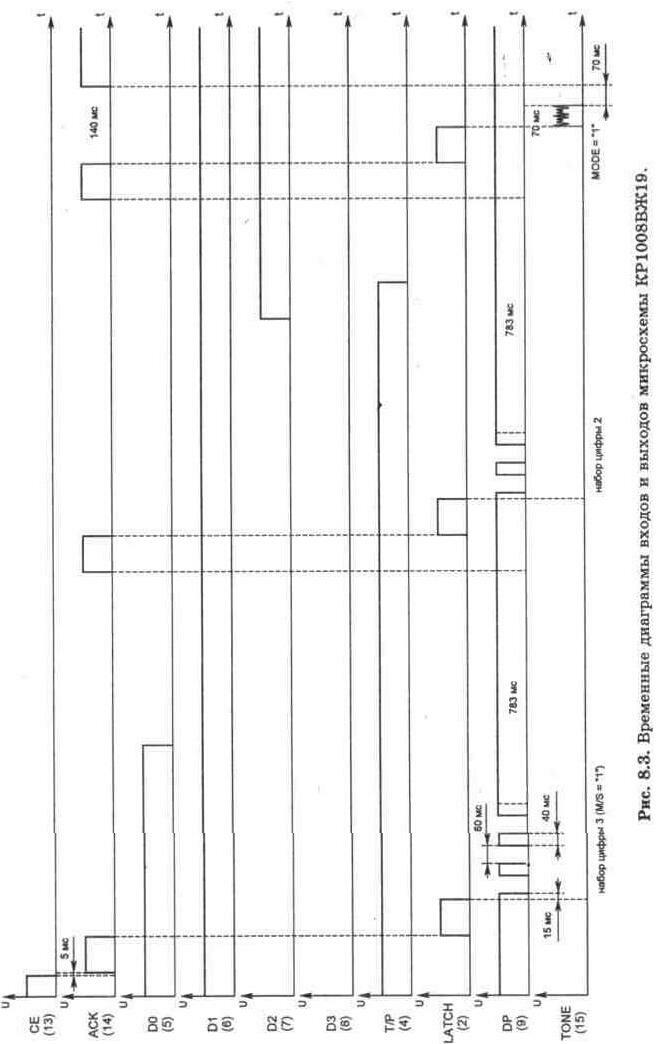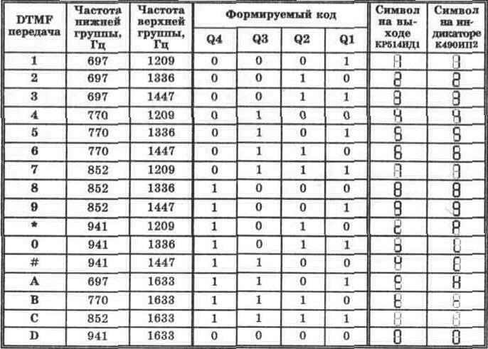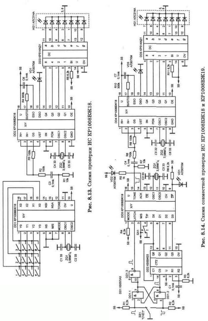 tGTA= 0,956xR1xC. Ha рис. 8.13 приведена схема проверки ИС КР1008ВЖ18. В качестве номеронабирателя тонального сигнала используется ИС КР1008ВЖ16. При нажатии на любую кнопку номеронабирателя с выхода TONE (вывод 12) через разделительный конденсатор СЗ DTMF сигнал подаётся на вход ОУ ИС КР1008ВЖ18. Тональный сигнал декодируется и 4-разрядный двоичный код (табл. 8.7), соответствующий входному DTMF сигналу, подаётся на входы 1, 2, 4, 8 дешифратора КР514ИД1. С момента опознавания и до окончания тональной посылки горит светодиод VD1. Выходы a - g дешифратора подключены к семисегментному светодиодному индикатору. Символ на индикаторе соответствует предпоследней колонке табл. 8.7. Дешифратор КР514ИД1 содержит внутренние токоограничивающие резисторы (Iвых. = 5 мА), что позволяет подключать индикаторы с общим катодом AJI304A (Б, В), АЛС314А непосредственно к выходам дешифратора. Для использования индикаторов с общим анодом (АЛС324Б, АЛСЗЗЗВ.Г и т. п.) следует применить дешифратор КР514ИД2 (рис. 8.11) или К555ИД18. Поскольку выходы ИС КР514ИД2 выполнены на транзисторах с открытым коллектором, то необходимо установить ограничительные резисторы сопротивлением 300 Ом. Схему можно упростить, применив ИС управляемого индикатора со схемой дешифрации К490ИП2 (рис 8.12). На рис. 8.14 приведена схема совместной проверки ИС КР1008ВЖ19 и КР1008ВЖ18. В исходном состоянии на выходе логических элементов DD1.2, DD1.3 и на выходах Q0 - Q3 десятичного счётчика DD2 К555ИЕ5 - "низкий" уровень, а на выходе АСК ИС КР1008ВЖ19 - "высокий" уровень. Цепь С1, R3 при включении схемы устанавливает выходы ИС DD2 в состояние логического "0" . При нажатии на кнопку SB1 выходы DD1.2 и DD1.3 переходят из "низкого" в "высокий" и ИС КРЮ08ВЖ19 загружает двоичный код по входам D0 - D3. В момент отпускания кнопки RS-триггер на логических элементах DD1.1 и DD1.2 перебрасывается обратно, что приводит к набору загруженной цифры и переводит счётчик DD2 на один такт вперёд. Тональный сигнал "*" с выхода TONE ИС КРЮ08ВЖ19 поступает на вход ИС КР1008ВЖ18 и на индикаторе HGI отображается символ декодированного сигнала (табл. 8.7). С момента загрузки двоичного кода и до окончания набора номера горит светодиод VD2. При следующем нажатии кнопки SB1, происходит набор очередной цифры "1" и т. д. Если переключатель SA1 находится в положении "Р", то при наборе очередной цифры мигает светодиод VD1 с частотой импульсного набора 10 Гц. Количество импульсов соответствует набранной цифре.