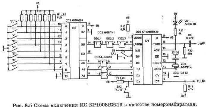 На рис. 8.4. приведена схема включения ИС КР1008ВЖ19. Входы DO -D3, LATCH и выход АСК подключены к микроконтроллеру. Выход TONE подключен к усилителю сигнала DTMF, a DP к импульсному ключу. Если используется ИС UM91531, то конденсаторы С2 и СЗ можно не применять. На рис. 8.5 приведена схема включения ИС КР1008ВЖ19 в качестве номеронабирателя. Для преобразования сигналов клавиатуры в двоичный код используется ИС приоритетного шифратора 8-3 К556ИВ1. При нажатии одной из кнопок клавиатуры "0" - "7" на выходах А0 - A3 (выводы 9, 7, 6) формируется двоичный код этой цифры. Логические элементы DD2.4 - DD2.6 инвертируют его и подают на входы D0 - D2 ИС КР1008ВЖ19. На выходе GS ИС К555ИВ1 (вывод 14) в момент нажатия кнопки клавиатуры изменяется уровень из "высокого" в "низкий", а на выходе инвертора DD2.3 из "низкого" в "высокий". Изменение уровня из "низкого" в "высокий" на входе LATCH загружает двоичный код на входах D0 - D3. В момент отпускания кнопки клавиатуры обратное изменение уровня на выходе GS ИС К555ИВ1 и на входе LATCH ИС КР1008ВЖ19 приводит к набору номера на выходе TONE