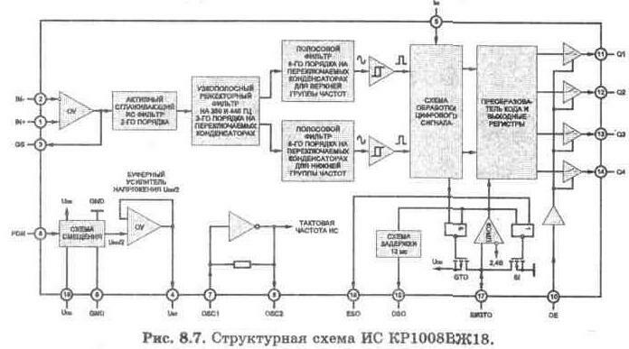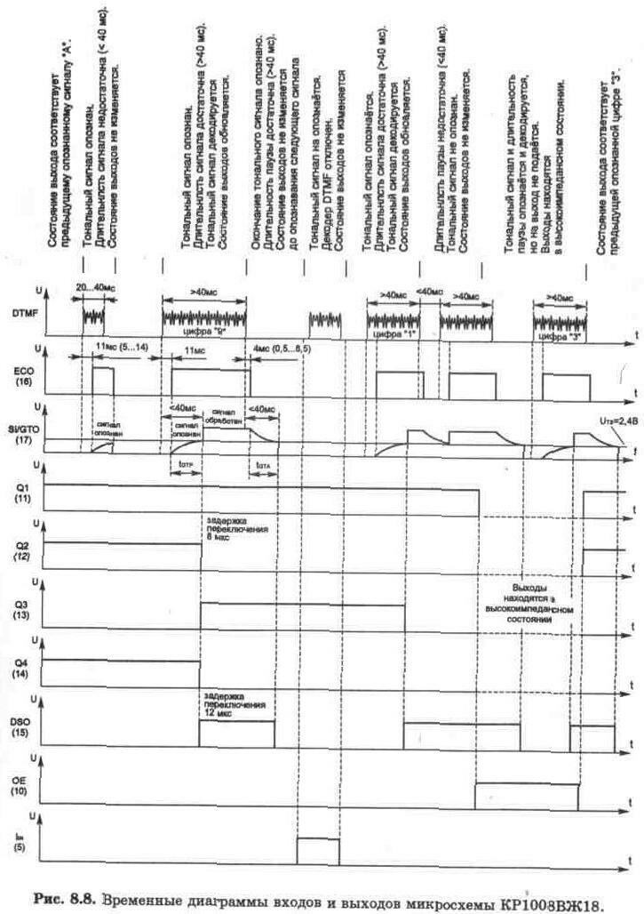 или DP (в зависимости от положения переключателя SA1). С момента загрузки двоичного кода и до окончания набора цифры горит светодиод VD1. Во время свечения светодиода VD1 набор следующей цифры невозможен. Если перевести переключатель SA2 в разомкнутое состояние, то это позволит производить набор цифр больше 7. В тестовом режиме ИС КР1008ВЖ19 позволяет осуществлять тональный и импульсный набор номера с гораздо более высокой скоростью. Если изменить состояние входа M/S, когда вход выборки кристалла СЕ (вывод 13) находится в активном ("низкий" уровень) состоянии, включается тестовый режим. ИС остаётся в тестовом режиме до тех пор, пока не будет отключена. Импульсный набор номера в тестовом режиме осуществляется в 48 раз быстрее (с частотой 480 Гц). Тональный набор номера осуществляется в 8 раз быстрее (длительность тональной посылки и паузы между тональными посылками составляет 8,75 мс). При этом нижняя и верхняя группа частот разделяются по выходам TONE и DP. Для цифр 0, 1, 6, 8 на выходе TONE будет присутствовать сигнал с частотой нижней группы двухчастотной посылки, а на выходе DP - верхней. Для цифр 2, 3, 4, 5, 8, 9, *, #, А, В, С, D на выходе TONE будет присутствовать сигнал с частотой верхней группы, а на выходе DP - нижней. На выход TONE подаётся синусоидальный сигнал, а на выход DP - прямоугольные импульсы соответствующей частоты. Микросхема КР1008ВЖ18 представляет собой приёмник - декодер двухтонального (DTMF) сигнала (код 2 из 8). ИС изготавливается в пластмассовом корпусе типа 2104.18-А (DIP-18) по КМОП технологии и содержит полосовые фильтры на переключаемых конденсаторах. Микросхема контролирует длительности поступающих двухтональных посылок и пауз между ними. Выходная информация выводится в виде 4-разрядного двоичного кода. Тактирование микросхемы осуществляется кварцевым генератором. Основные характеристики ИС КР1008ВЖ18 Детектирование всех 16 стандартных DTMF сигналов. Низкая потребляемая мощность: 15 мВт. Один источник питания: 5 В+5%. Используется стандартный телевизионный кварцевый резонатор с частотой 3,579545 МГц. Выходы с тремя состояниями. Режим понижения потребляемой мощности в неактивном состоянии. Низкая вероятность ошибки декодирования: 1/10000. Основные области применения ИС КР1008ВЖ18 ° Приёмные устройства АТС. ° Системы передачи сигнала поискового вызова. ° Дистанционные системы управления. ° Системы кредитных карт. ° Пейджеры. ° Автоответчики. ° Бытовые автоматические системы. ° Мобильные радиосистемы. Цоколёвка ИС приведена на рис. 8.6, назначение выводов в табл. 8.5, структурная схема на рис. 8.7. Электрические и временные характеристики приведены в табл. 8.6. Временные диаграммы входов и выходов приведены на рис. 8.8, параллельный код на выходах Q1 - Q4, соответствующий входному двухтональному (DTMF) сигналу, - в табл. 8.7. Табл. 8.5. Назначение выводов ИС КР1008ВЖ18.