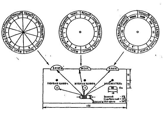Для определения номиналов резисторов с цветовой маркировкой я применяю конструкцию, которая состоит из трех дисков и прямоугольного основания. Каждый из дисков разделен на десять секторов. Раскраска секторов и надписи видны на рисунках. Диски закрепляются на прямоугольном основании так, чтобы их можно было свободно вращать. В основании прорезаны два окошка диаметром 5 мм и одно прямоугольное 10 на 5 мм. Сверху на основании имеются прямоугольные вырезы размером 10 на 2 мм. В верхних вырезах выставляем цвет колец, а в нижних читаем номинал резистора. Я думаю, это устройство намного удобнее, чем таблица, кстати; резисторы с цветовой маркировкой применяются и в отечественной радиоаппаратуре. Такое же приспособление можно изготовить и для определения номиналов конденсаторов с цветовой маркировкой.