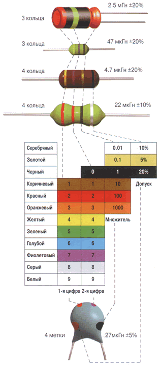 Цветовая маркировка индуктивностейВ соответствии с Публикациями IЕС 62 для индуктивностей кодируется номинальное значение индуктивности и допуск, т.е. допускаемое отклонение от указанного номинала. Наиболее часто применяется кодировка 4 или 3 цветными кольцами или точками. Первые две метки указывают на значение номинальной индуктивности в микрогенри (мкГн, uН), третья метка — множитель, четвертая — допуск. В случае кодирования 3 метками подразумевается допуск 20%. Цветное кольцо, обозначающее первую цифру номинала, может быть шире, чем все остальные. |