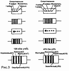 Например 4кЗИ ≈ резистор сопротивлением 4,3 килоома с допуском +5%, 11kF ≈ резистор сопротивлением 11 килоом с допуском +1% 3. Цветовым кодом. Для обозначения номинального сопротивления и его допустимого отклонения на резистор наносятся в определенном порядке цветные кольца (пояски) или точки. Номинальное сопротивление выражается в омах двумя или тремя цифрами с множителем 10п, где п ≈ целое число в пределах -2...+9. Маркировочные знаки сдвинуты к одному из торцов резистора и ближайший к торцу знак считается первым. Если длина резистора не позволяет сдвинуть маркировку к одному из торцов, то первый знак (поясок, точка) делается примерно в два раза тире, остальных. Расположение знаков на резисторе показано на рис.3. Цвет маркировочных знаков приведен в табл.2.