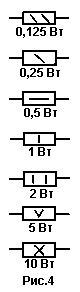 Допустимая мощность рассеяния ≈ это та мощность протекающего через резистор тока, которую он может длительное время выдерживать и рассеивать в виде тепла без ущерба для своей работы. По существу, это характеристика электрической прочности резистора. Допустимая мощность постоянных резисторов указывается на схемах внутри условных графических обозначений, как показано на рис.4. Внешний вид наиболее распространенных резисторов типа МЛТ приведен на рис.5.
