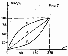 Разновидностью переменных резисторов являются подстроечные. В них изменение сопротивления производится с помощью отвертки при регулировке радиоаппаратуры и в дальнейшем не меняется. Для регулируемых резисторов существует еще один параметр ≈ зависимость сопротивления между начальным выводом и движком от угла поворота (Ос) движка, которая показана на рис.7.