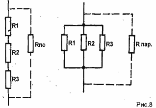 Собственные емкости большинства непроволочных резисторов широкого применения (ВС, МЛТ, С2-6, С2-13 и т.д.) составляют 0,1...1 пФ. У проволочных резисторовСс и Lc значительно больше, поэтому их frp на два-три порядка ниже. Если при конструировании устройства отсутствует резистор с необходимым сопротивлением, но есть резисторы других номиналов, то соединяя их последовательно или параллельно (рис.8), можно получить требуемое сопротивление.