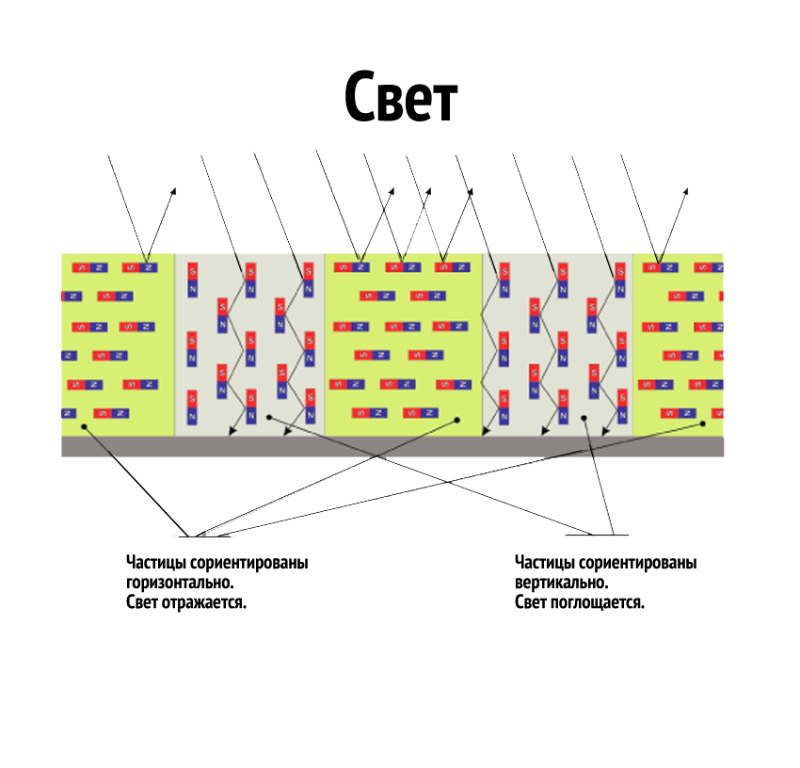 Оксид железа является магнитно-мягким материалом, с ничтожно малой остаточной намагниченностью. В связи с этим, частицы послушно ориентируются, по направлению к вектору воздействующего на них магнитного поля. От положения частиц зависит картинка, которую мы видим на «экране».