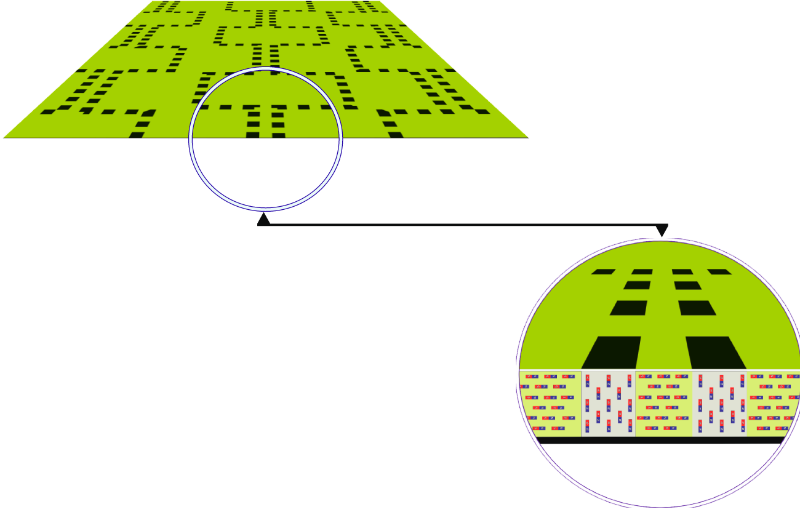 Под воздействием магнитного поля с вертикальным вектором, относительно плоскости индикаторного элемента, частицы оксида железа принимают вертикальное положение.