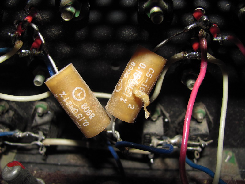 Вылетела искра и 2 (как я понял резистора каких-то необычных) вздулись и выкинули свои внутренности наружу