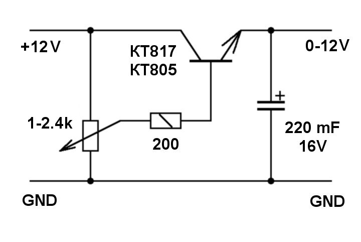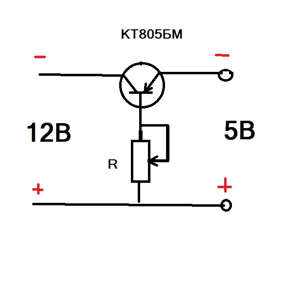 а к чему это. чтоб напряжение погасить? или что? если так, лучше включи переменный резистор потенциометром, так изменение тока на напряжение меньше влиять будетАлександр пишет: По этой схеме я смогу получить 5В 1Ампер? Сам придумал. Экспериментальным путём переменным резистором R подбирается напряжение и резистор меняется на с постоянным сопротивлением. КТ805БМ ток коллектор-эмиттер макс. 8А