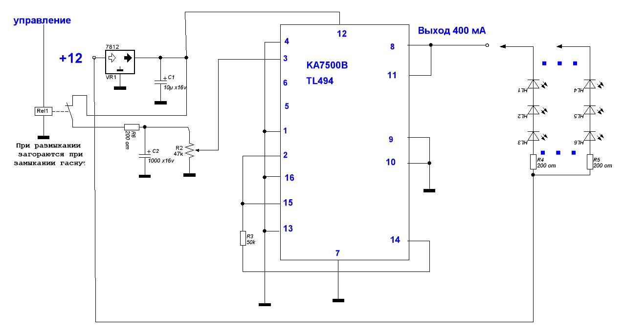 Схемы регуляторов для светодиодов с кондёром в базе транзистора не нравятся тем, что конденсатор заряжается нелинейно, транзистор - нелинейный элемент, характеристика светодиода нелинейна и имеет низкий диапазон. Плавное изменение яркости - не получается, мне не понравилось категорически. Самый наверное простой вариант - микроконтроллер. Но там свои заморочки - программатор и т.д. Для регулировки яркости для светодиодов хорошо подходят ШИМ (широтно импульсные модуляторы). Блок питания от компа валялся под боком, вот я и начал ваять именно на шим модуляторе от блока питания компьютера KA7500B он же TL494. Не скажу что все меня порадовало, но в целом работает. При размыкании реле плавно зажигаются, при замыкании гаснут. Схема должна быть подключена к бортовой сети постоянно, ток покоя 7 ма - в десятки раз меньше тока саморазряда аккумулятора. Интегральный стабилизатор Vr1 и конденсатор C1 можно не ставить, но с ними лучше. Переменным резистором устанавливают порог гашения, крутить медленно, так как в паралель конденсатор большой емкости.