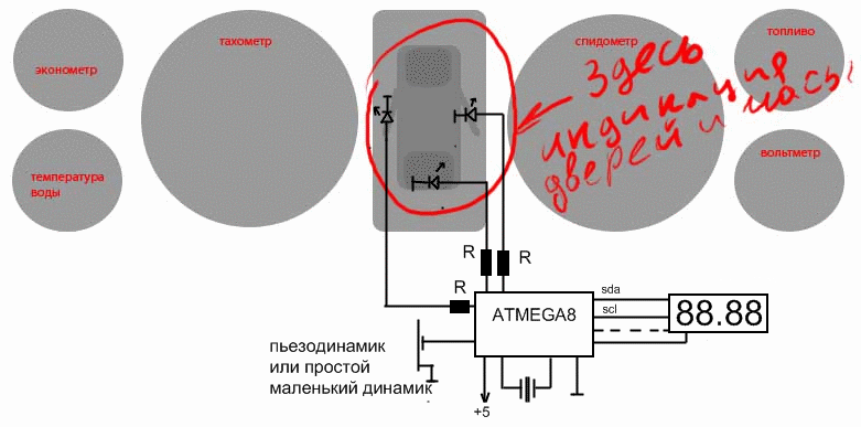 Есть машина ВАЗ 21074 напряжение 12 В. Идея переделать всю панель приборов и вмонтировать датчики в основные узлы. Собственно особых вопросов это не вызывало, но стало интересно еще и звуковую индикацию сделать на открывание двери, и саму индикацию открывания двери.