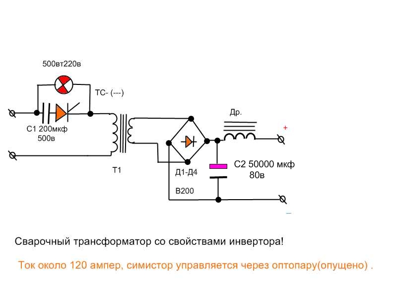 Суть: В момент касания электродом , тиристор открывается и питание сварочного тр-ра происходит через балластный конденсатор!