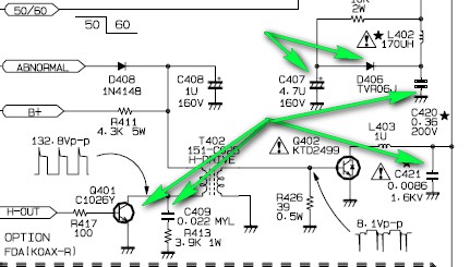 размер экрана 51, высокого нет, +В при включении поступает сразу 115 в, 24 и 16 в отключал, диод 180 в отключал провод к вид. усилкам отключил и хоть, что вместо 180 в всего 140. остальные напряжения в норме. 140, 24 и 16 вольт начинают идти соотвественно 10-8-110 В т.к при включении програм напруга 115 вольт падает до 108 вольт и где должно быть 180 то же 108 в и через 5-7 сек. становится 24-16 и 140. все остальные напряжения в норме - 5, 25, 12, 33 ит.д. высокого почти нет так еле-еле и глазом не заметно. не мерил. жаль нет ТДА 8362В новой, ставил просто 8362 без букв, напруги ещё меньше. т.е они(24,26, 140) поднимаются очень медленно, но начинает грется стро. транз. А в первом случаее не греется. пробовал ILA 8362 вообще уходит в звщиту.