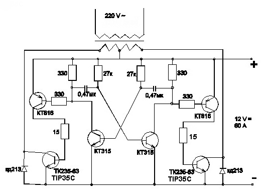 60 вт лампочка 6 ампер . А что хотел? 6х12=72 вт . Итого у тебя впустую всего 12 вт рассеивается. При холостом ходе 36 вт, реально схема очень простая и не имеет стабилизации . В сложных схемах или на специальных микрухах, при достижении номинального напряжения ограничивается либо ширина управляющих импульсов либо ограничивается амплитуда тока через управляющий транзистор (транзистор искуственно запирается). У тебя этого ничего нет, а сопротивление первичной обмотки пару ом или пару десятых ома. Для тех целей что ты анонсировал, холостой ток не нужен. Нужно реле, которое будет переключать с 220 на инвертор и другое которое подключит аккумулятор. Насчет конденсатора, на выходе инвертора будут гармоники и сигнал далекий от синусоиды. Гармоники давятся конденсатором, типа закорачиваются а это тоже мощность. Так что я думаю что все нормально. Конденсатор нужно подбирать не чем больше - тем лучше, а чтобы вторичная обмотка транса с кондером контур образовывала на 50 гц. Если есть осциллограф, то можно через делитель форму посмотреть сигнала и по ней подбирать, начиная с 0.1 мкф. Но 10 по любому много, подключи к сети 220 через амперметр и удивись сколько тока через него пройдет. И еще в данной схеме (и в той что я прилепил) нет мертвого времени, т.е. какое-то время ток может течь в обоих плечах одновременно и навстречу друг другу (пока носители в базе одного из транзисторов не рассосутся) а это тоже мощность и не маленькая. И ИБП и инверторах обычно это время присутствует, но они сложнее. У тебя КПД где-то 85% для такой простой схемы это нормально, даже очень хорошо.