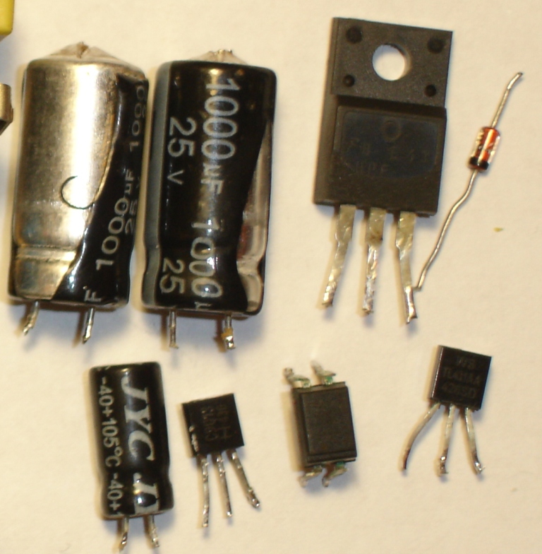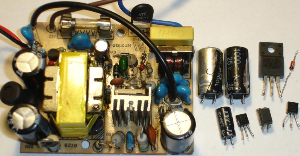 при проверке пробиты такие элементы конденсаторы 1000*25в-вых.фильтр,С9013-задающий ,стабилитрон В18 ,РС817-оптопара,ТЛ431-образцовый стабилизатор и неизвестный транзистор ,звонящийся накоротко во всех направлениях