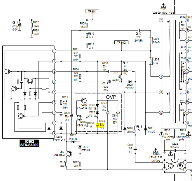 Ну я понимаю запуск блока так. При появлении напряжения на выводе 2 транса, заряжается конденсатор С817. Импульс тока зарядки, по первичной обмотки, создаёт ток во вторичной, который через С818,С819 и транзистор, у которого Э и К с диодами, модуля 1С802,( он открывается непосредственно от вторичной обмотки)(вывод 8 ) . Открывают ключ (самый левый транзистор модуля). Ключ открываясь, увеличивает ток по 1й обмотки лавиной. Все остальные транзисторы открываясь препятствуют генерации БП.