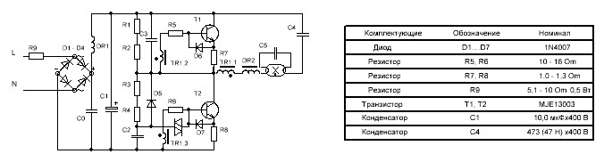 В таблице указаны номиналы деталей, которые мне приходилось устанавливать взамен сгоревших. В нете есть статьи в которых говорится, что возможна замена этих деталей, на детали с номиналами в более широких пределах. Например. Резисторы R5, R6 могут быть до 22 Ом, а резисторы R7, R8 до 2,7 Ома. Не знаю, не пробовал устанавливать с такими номиналами. Есть множество статей о технологии ремонтов электронных балластов, поэтому останавливаться на этом не буду. Добавлю лишь, что провод обмотки TR1.3 не должен прикасаться к проводам обмоток TR1.1 и TR1.2. Конечно, лаковая изоляция проводов и должна бы выдержать рабочее напряжение, но зачем лишний риск! Устранить их соприкасание не трудно.