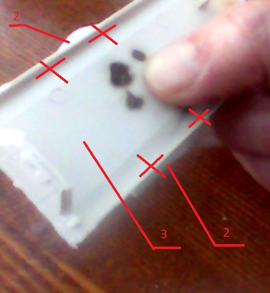 Советую внимательно посмотреть, как приложена деталь 2 – не нужно поворачивать её на 180 гр. в горизонтальной плоскости. Но даже если и ошибётесь, то ничего ужасного не произойдёт. Всё же, сделать так как на фото будет лучше. В отмеченных, крестиком, местах сверлим 4 отверстия диаметром 0,9 – 1 мм. В дальнейшем эти детали мы будем "сшивать", крепить между собой. Для крепления использую эмаль провод диаметром 0,35 – 0,4 мм. По одному проводу на каждую сторону. Это не верх технологий соединений. Например, можно склеить эти детали. Закопчённые места от сгоревших резисторов можно удалить наждачной шкуркой или между платой и деталью 3 положить изоляцию - прокладку из бумаги, или приклеить скотч. Учимся у наших китайских братьев.