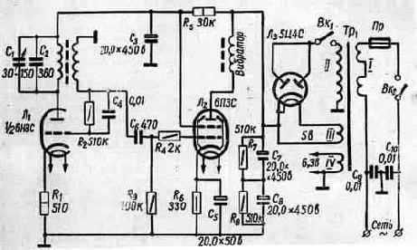 Прибор для ультразвуковой очистки и промывки мелких деталей. Прибор состоит из генератора электрических колебаний ультразвуковой частоты. Задающий генератор собран на лампе Л1. Рабочая частота генератора 18 кГц. Конденсатором С1 частоту можно плавно перестраивать в пределах 16-20 кГц. Усилитель мощности собран на лампе Л2. В ее анодную цепь включена обмотка возбуждения вибратора, намотанная на каркасе диаметром 15 мм (длина намотки 120 мм провод ПЭЛ 0,41, число витков 600). Внутрь каркаса помещен излучатель ультразвуковых колебаний - ферритовый стержень от обычной магнитной антенны. Прибор работает от сети переменного тока и потребляет 80 Вт при выходной электрической мощности 10-12 Вт. Выпрямитель собран по однополупериодной схеме на лампе Л3, анодное напряжение равно 500В.