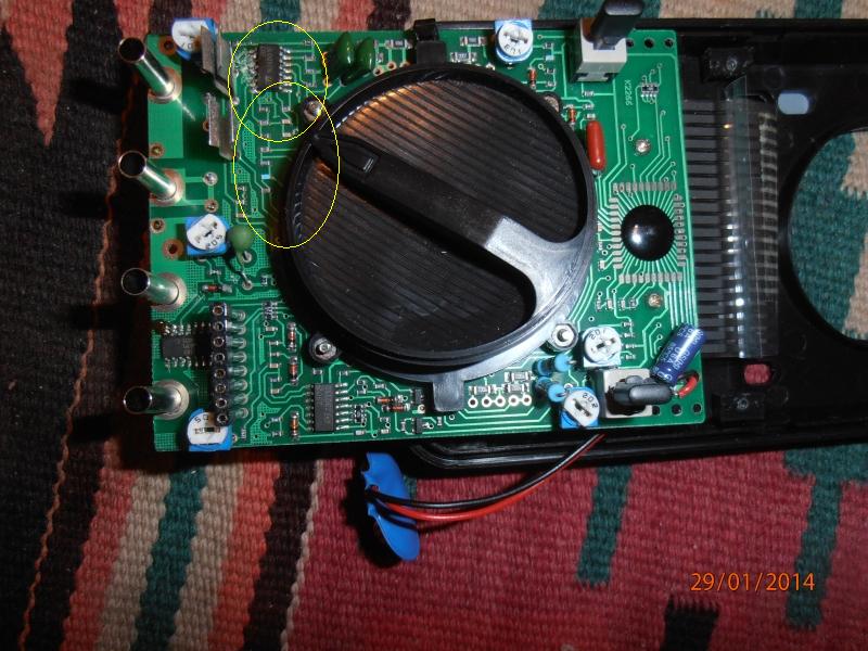 Смотри на выделенное желтым цветом. Опознавай SMD элементы и прозванивай их. Микросхема скорее всего тоже под замену. Опыт планарного монтажа у тебя есть? Если нет, то смотри сам. Если не жалко - тренируйся как раз на данном приборе