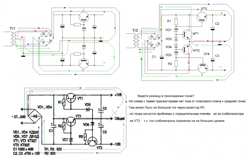 Может кто не понимает разницу в схемах? Привожу движение токов нагрузки по схемам: