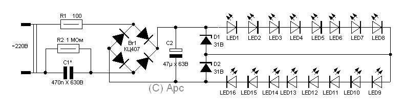 Третья схема очень похожа, только две гирлянды(петли) и параллельно 4.7 мкФ на 400В