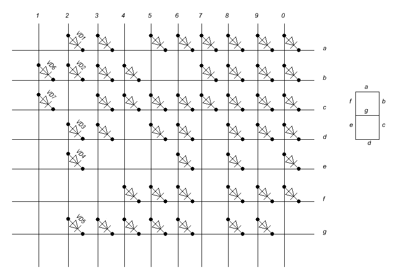 И ещё. Что бы матрица работала с К155ИД1 (у неё открытые коллекторы выходных транзисторов) диоды, в схеме, нужно развернуть на 180 градусов. С + питания индикаторных ламп, через резисторы, подать напряжение на выхода 1,2,..-0 дешифратора. Выходной ток м.схемы не должен, вроде бы, превышать 2 мА. Для сокращения к-ва диодов имеет смысл применить динамическую индикацию. Здесь могли бы пригодиться Ваши м.схемы КП - мультеплексоры.